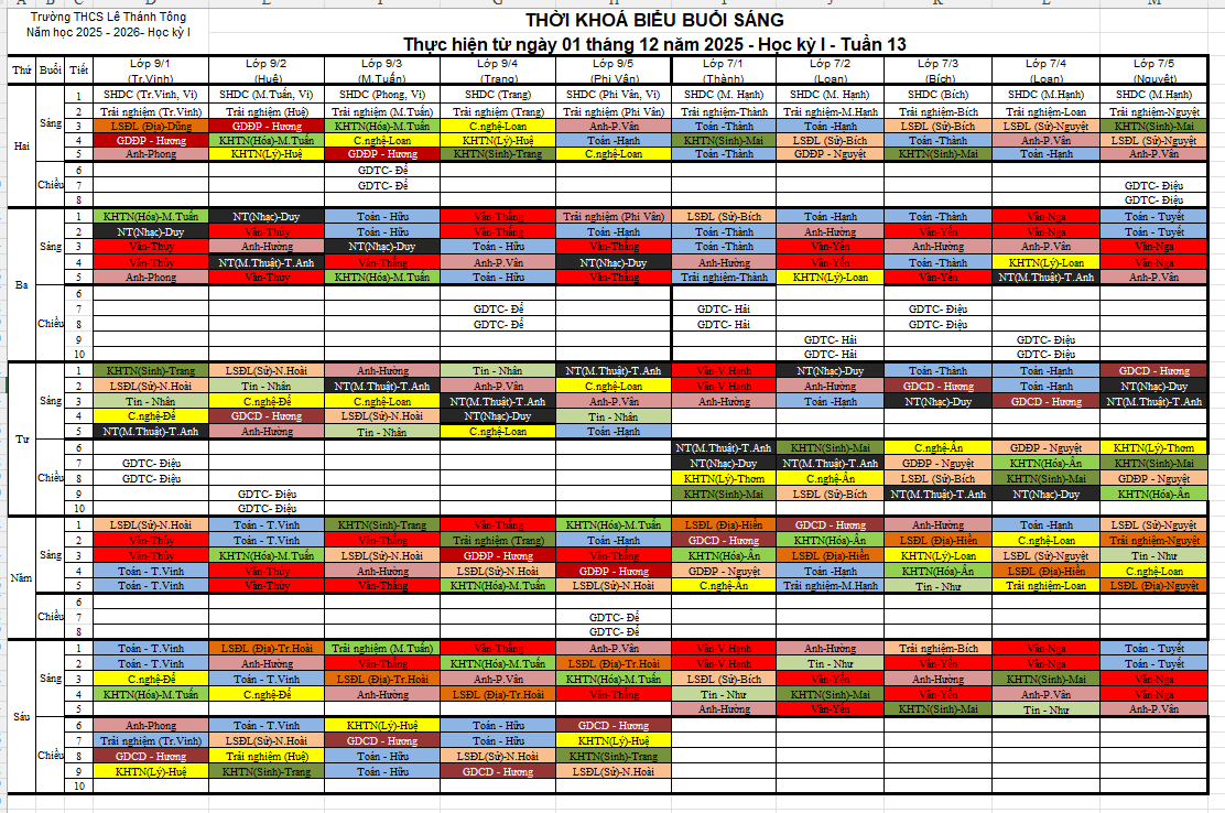 Thời khoá biểu Tuần 13 HKI - Năm học 2025-2026 (áp dụng ngày 01/12/2025)