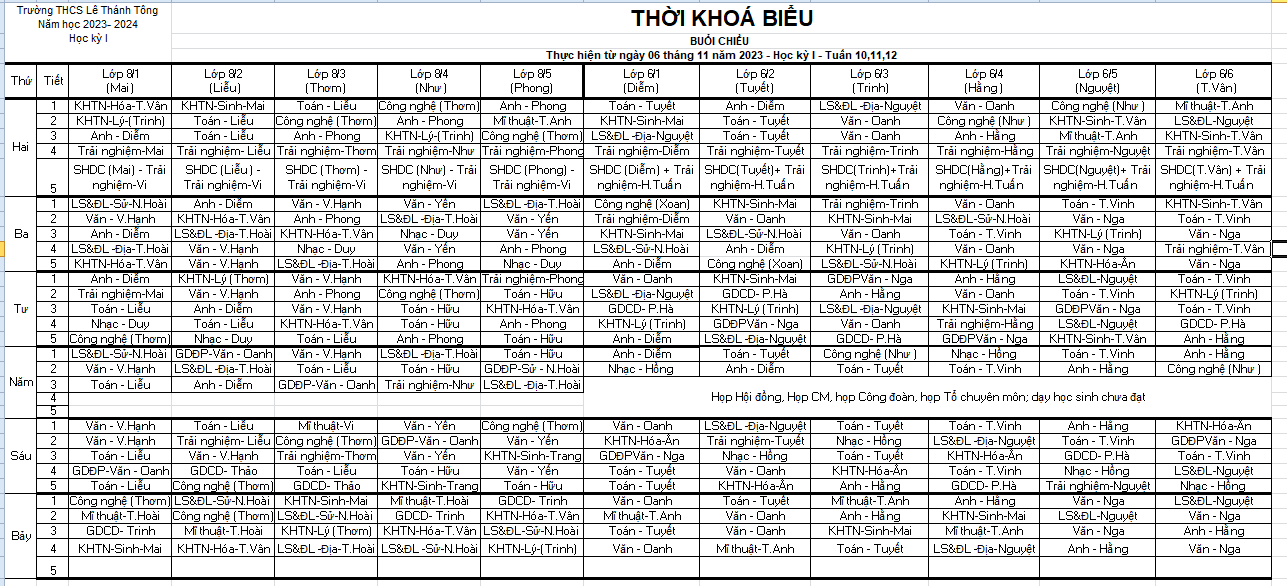 Thời khóa biểu - Chiều- Tuần 10,11,12 năm học 2023-2024