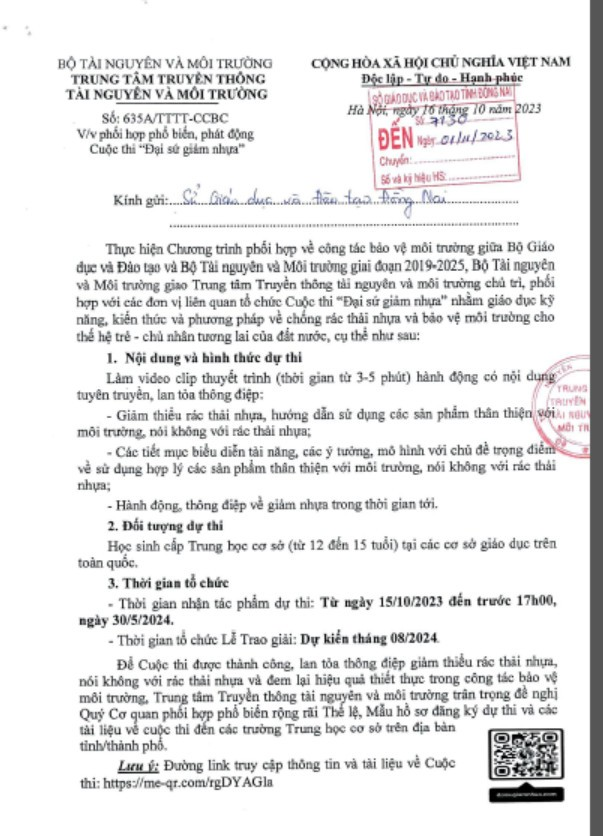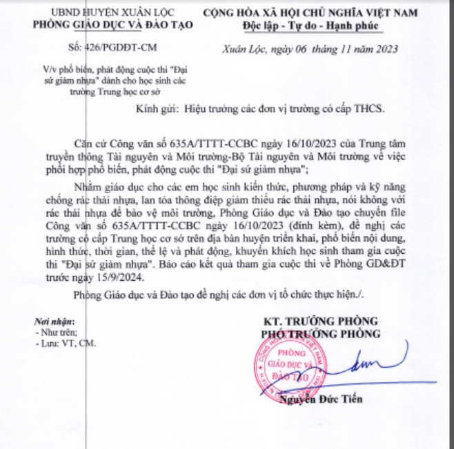 Thông báo về việc tham gia cuộc thi "Đại sứ giảm nhựa" năm học 2023-2024