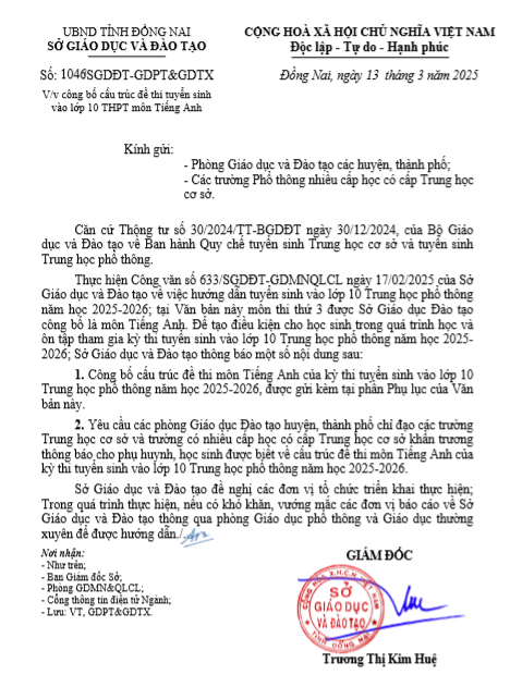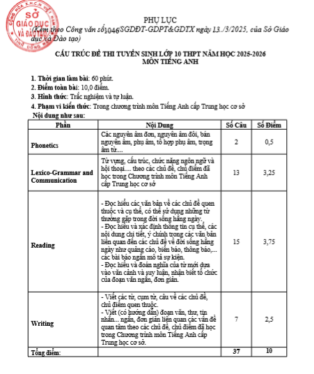 Công bố cấu trúc đề thi Tiếng Anh tuyển sinh lớp 10 năm học 2025-2026